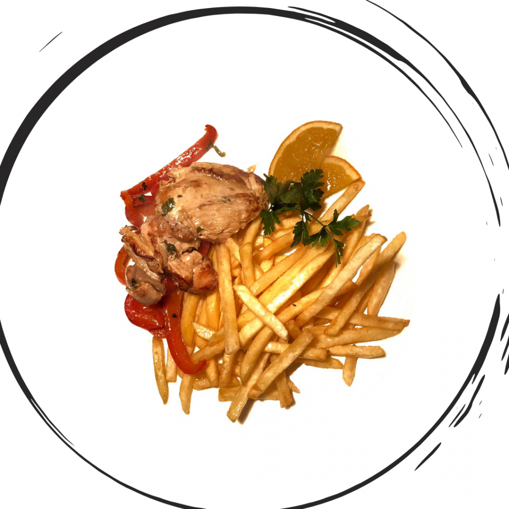 Hähnchen-Oberkeule in Orangenmarinade und Pommes